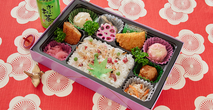 福千歳 (ふくちとせ) 1,000円(税込) 注文数 個 カートへ カートに入れる 清楚の中にゆったりとした華やかさを感じるお弁当。和洋中惣菜をバラエティ豊かに盛り込みました。 内容 白飯・梅ちりめん・グリンピース・桜漬・俵メンチ・ポテトサラダ・鯖塩焼き・花蓮根・カレーコロッケ・ピンク焼売・黒酢あんかけ肉団子・大根サラダ・お茶缶