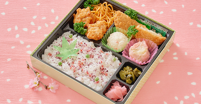 春曙 (はるあけぼの) 800円(税込) 注文数 個 カートへ カートに入れる ボリュームたっぷり春のパワフル弁当。和風ご飯と味わいの異なる多種の惣菜をバラエティ豊かに盛り込みました。 内容 白飯・梅ゆかり・グリンピース・スパゲティナポリタン・鶏もも唐揚げ・チーズ入りメンチ・クリーミーコロッケ・ポテトサラダ・ピンク焼売・桜漬・胡瓜漬