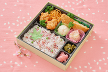 春たけなわの穏やかな風景をイメージしました。あっさりとした梅ゆかりをトッピングしたご飯と和洋中のバラエティ豊かな惣菜の組み合わせが楽しいお弁当。