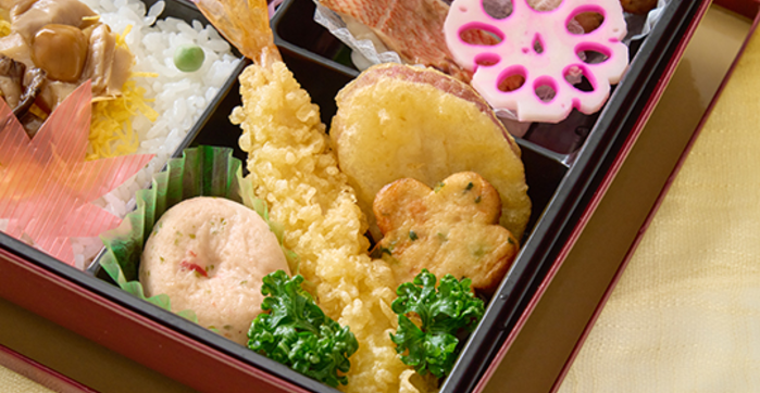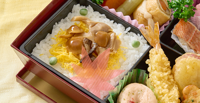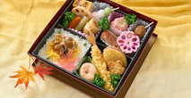 龍雲 (りゅううん) 2,000円(税込) 注文数 個 カートへ カートに入れる 重厚感ある容器に、この時季ならではの山海の惣菜を贅沢に味わい深く盛り込んだ創作松花堂弁当。秋の彩りにおもてなしの心を添えました。 内容 白飯・錦糸玉子・きのこミックス・グリンピース・厚焼き玉子・三色団子・人参煮・蓮根煮・しのだ巻・蕗煮・ピンク焼売・赤魚西京焼・花蓮根・つくね串・海老天ぷら・彩りしんじょう・さつまいも天ぷら・豆腐揚げ