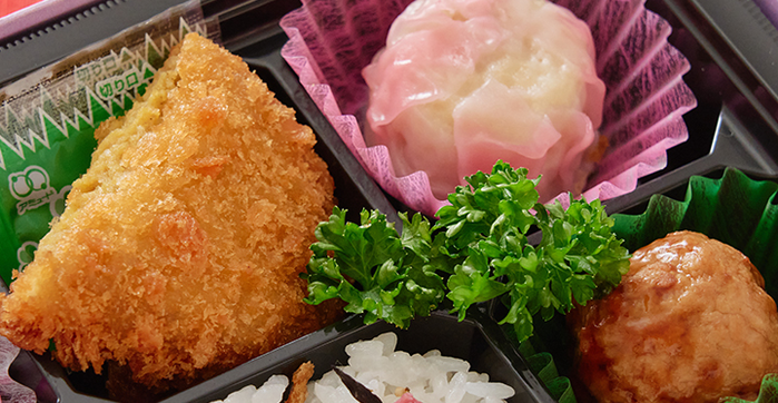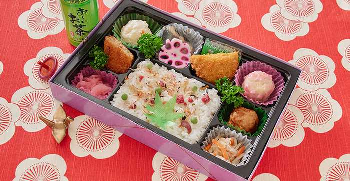 福千歳 (ふくちとせ) 1,000円(税込) 注文数 個 カートへ カートに入れる 清楚の中にゆったりとした華やかさを感じるお弁当。和洋中惣菜をバラエティ豊かに盛り込みました。 内容 白飯・梅ちりめん・グリンピース・桜漬・俵メンチ・ポテトサラダ・鯖塩焼き・花蓮根・カレーコロッケ・ピンク焼売・黒酢あんかけ肉団子・大根サラダ・お茶缶